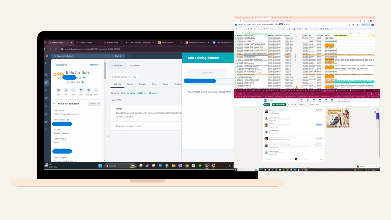 The Managing Director hired me to find key contact personas, their affiliated institutions and companies (VET, Universities, Colleges) , their contact details, and relevant industry-related courses for CFG’s marketing outreach. I used LinkedIn, ContactOut, Apollo.io, RocketReach, Signal Hire, Hunter.io along with ZoomInfo to find their contact details, and Verifalia to validate the email addresses. Once verified, I entered the data into Google Spreadsheets and HubSpot. I also maintained the company’s CRM deals pipeline. Additionally, I cleaned and maintained their CRM by deduplicating entries, updating contact details, suburbs, and applying relevant tags. This contributed to more efficient data management and supported their targeted marketing initiatives.