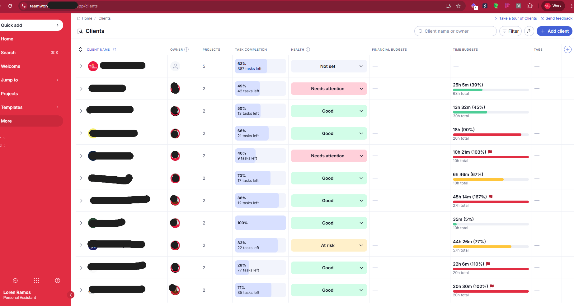 Based on the client data from the Teamwork dashboard, I allocated time for each client’s time budget and team member’s capacity. I set the time limit for each client to track how much time is spent on them.
